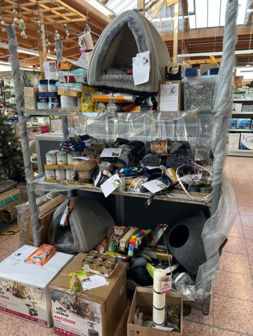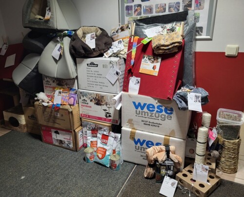 Mit drei vollen Autos fuhr das Team zurück ins Tierheim, um dort die Geschenke zu sortieren. Der ganze Flur stand voll und im Lager wurden auch noch einige Kisten untergebracht.