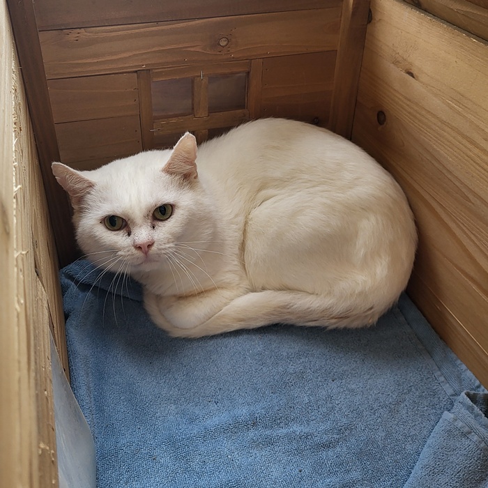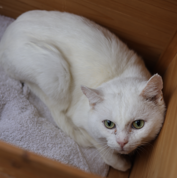 Ernie kam genau wie Bert über das Veteri­näramt ins Tierheim. Deshalb Erni und Bert wie bei den Muppets. Charak­terlich scheinen sie sich auch sehr ähnlich zu sein. Ängstlich, versteckt und wohnhaft in einer der Schub­laden im G2. Auch beim schnee­weißen Erni muss erst noch der „Knoten platzen“, damit er merkt, dass es außerhalb der Kommode ein Leben gibt, welches inter­essant sein kann und man auch nur ein neues Zuhause findet, wenn man sich zeigt und auf die Besucher zugeht. Oder sich zumindest anschauen lässt. Ohne zu Fauchen. Naja, geben wir ihm noch Zeit anzukommen oder vielleicht kann das ja auch bei seinen neuen Dosen­öffnern statt­finden. Wir und sicher auch Ernie, hätten nix dagegen.