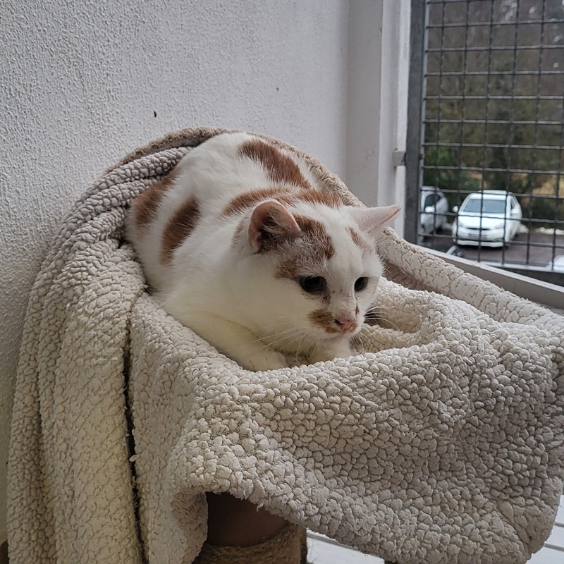 Taylor ist unsichtbar. Im großen Katzenraum gibt es viele Häuschen, Höhlen und Ecken. In der hintersten sitzt dann sicher Taylor. Dabei ist sie eine sehr hübsche Katze, weiß mit rot und schönen Augen. Sie mag gern mit anderen schüch­ternen Katzen zusammen liegen, das scheint ihr Sicherheit zu geben, deshalb nehmen wir an, dass sie sicher auch im neuen Zuhause gern eine andere Katze bei sich haben mag. Die Menschen, die sie, hoffentlich bald, zu sich nehmen wollen, sollten lange Geduld und Zuver­sicht haben, Taylor langsam ankommen lassen und sie entscheiden lassen, wann sie Vertrauen und Nähe zulassen kann. Bei einigen Katzen geht das sehr schnell, auch wenn sie bei uns so scheu wie Taylor waren. Als Fundkatze sollte Taylor nach der Einge­wöh­nungszeit die Gelegenheit zum Freigang bekommen.