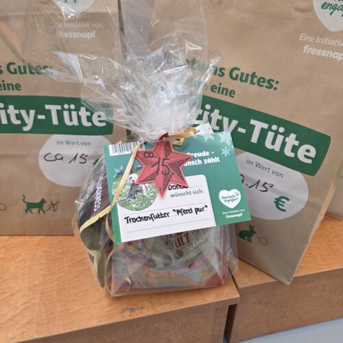 Such dir eine Karte von dem Wunschbaum aus und suche das Produkt aus dem Sortiment vom Fressnapf raus. Bezahle die Produkte an der Kasse und zu Weihnachten werden die Spenden dann unseren Fellnasen überreicht.